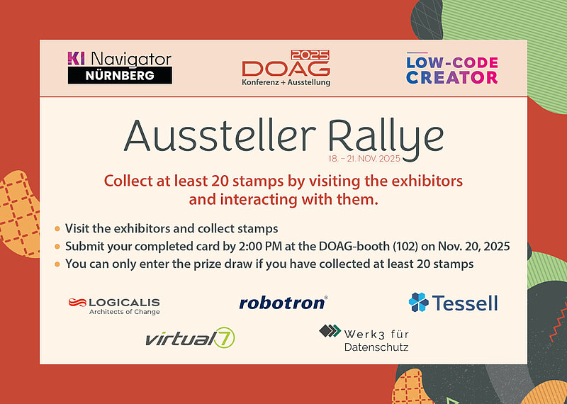 - Gebt eure ausgefüllte Karte bis zum 20. November 2025 um 14:00 Uhr am DOAG-Stand (Ebene 1) ab.